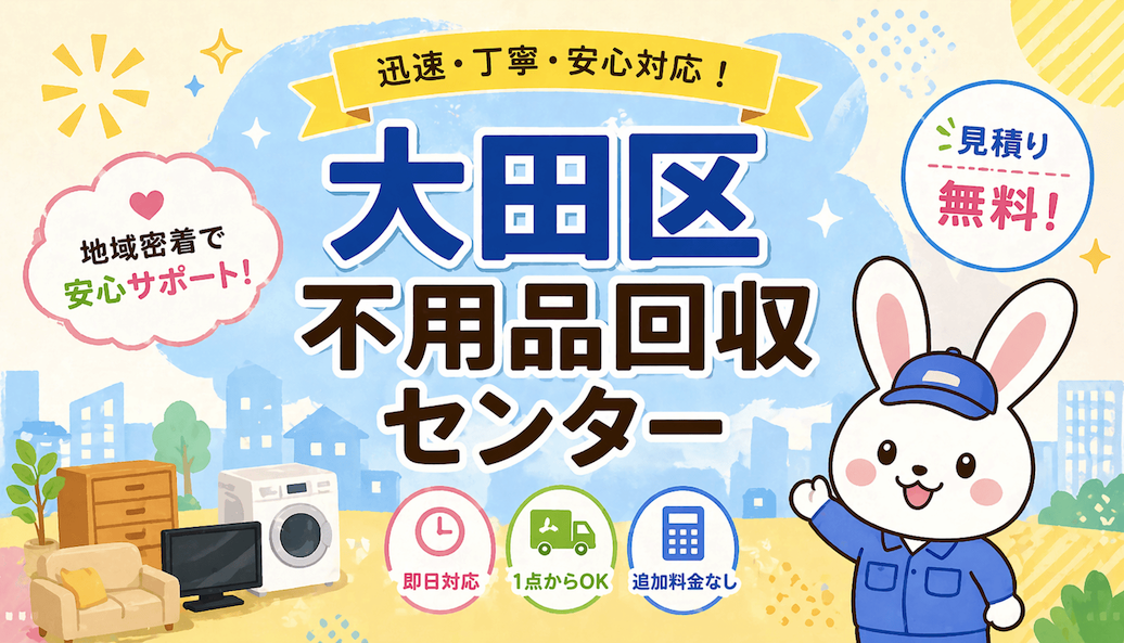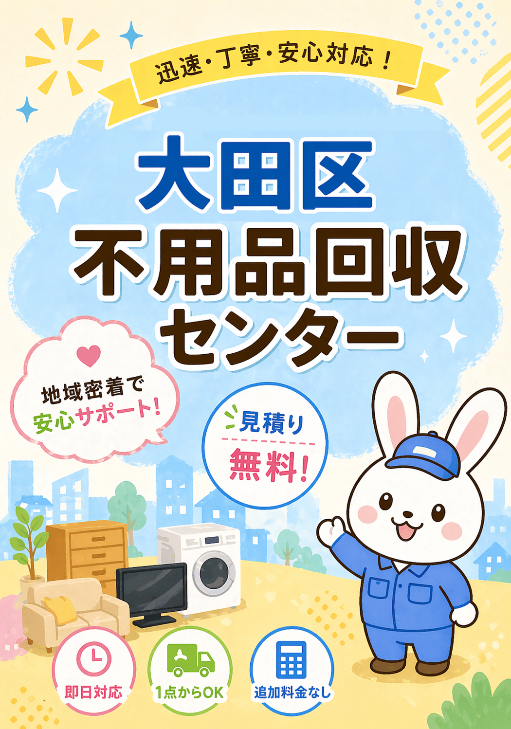 家具、家電、日用品など、ご家庭から出る不用品を回収します。粗大ゴミとして出せない物や、重くて運べない物もお任せください。大田区のルールに従って適正に処分します。